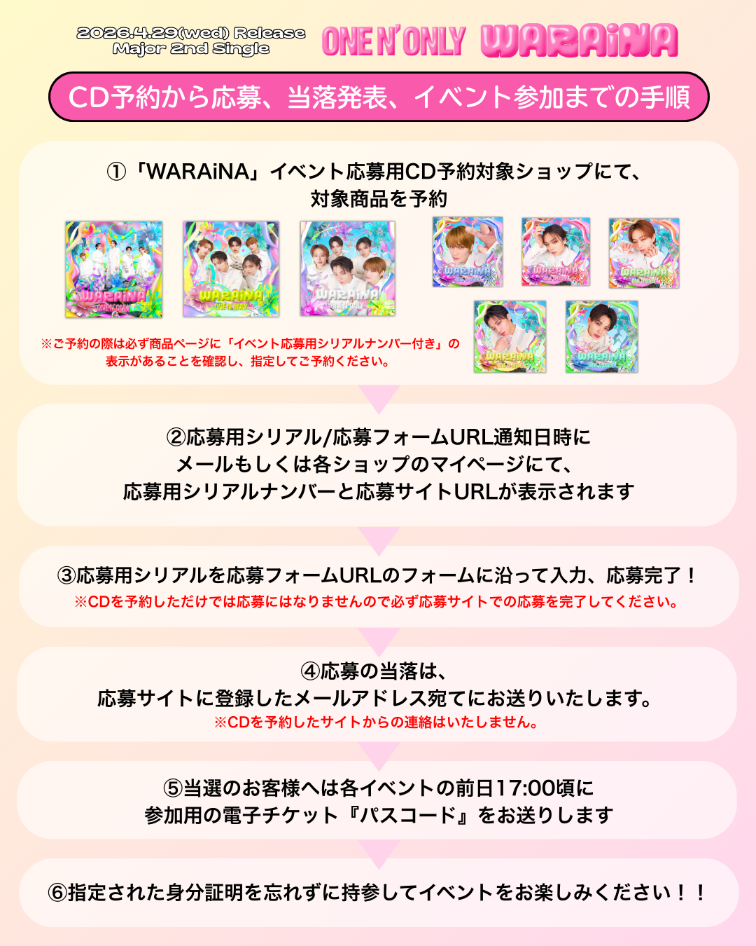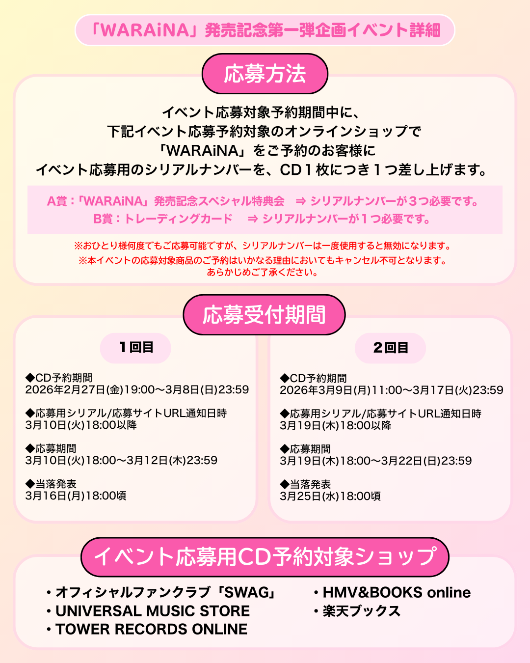 イベント応募対象予約期間中に、下記イベント応募予約対象のオンラインショップで「WARAiNA」をご予約のお客様にイベント応募用のシリアルナンバーを、CD1枚につき1つ差し上げます。