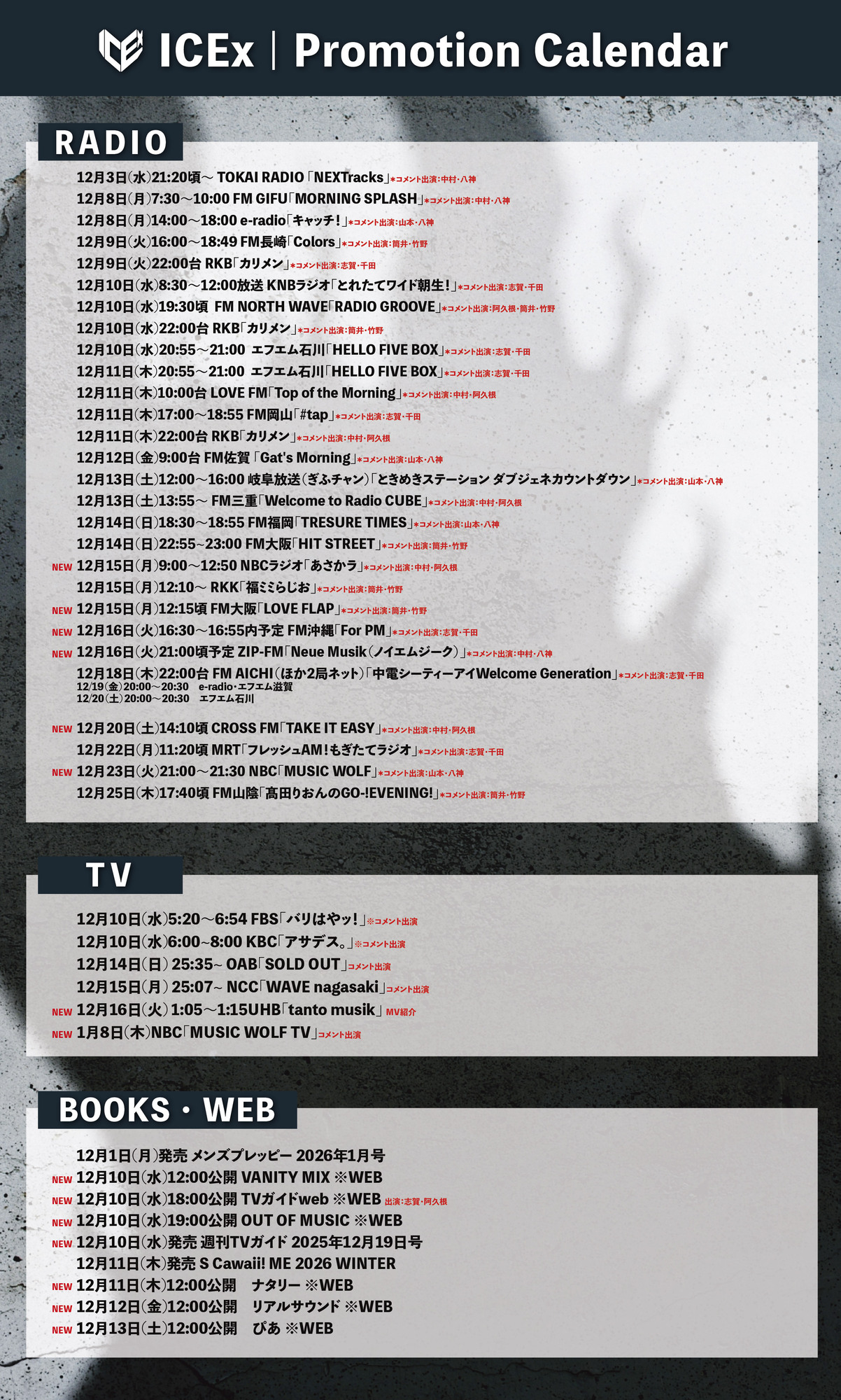 12月13日更新情報!ICExが各メディアに登場し、7thシングル「Da-Da-Da」の発売を盛り上げます!ぜひチェックしてください!