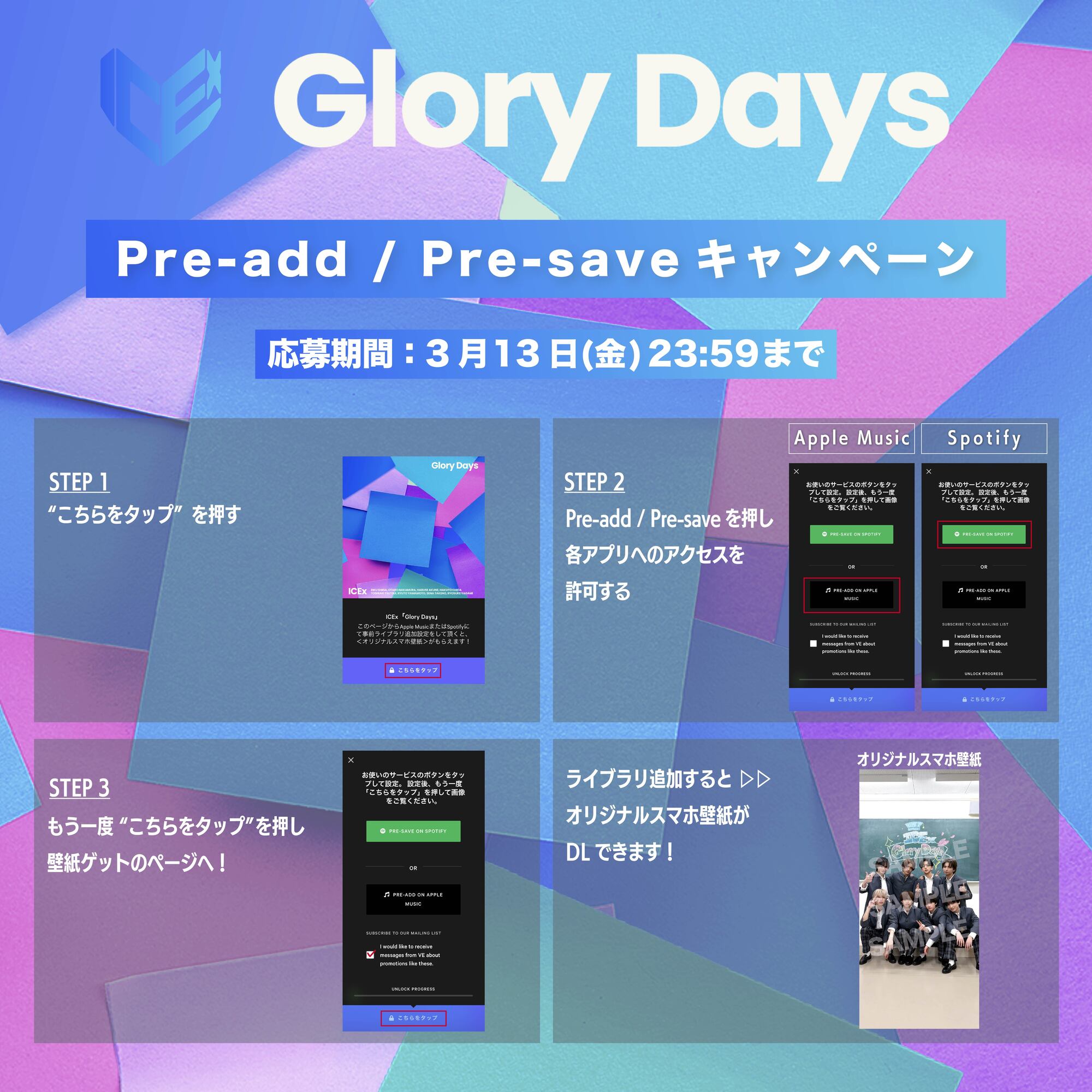 3月14日(土)配信ICEx「Glory Days」を、リリース前日までにApple Music/Spotifyで事前ライブラリ追加をしてくれた方全員に、スペシャル待ち受けをプレゼント!是非ご自身のライブラリに事前追加して、「Glory Days」のリリースをお楽しみにお待ちください!