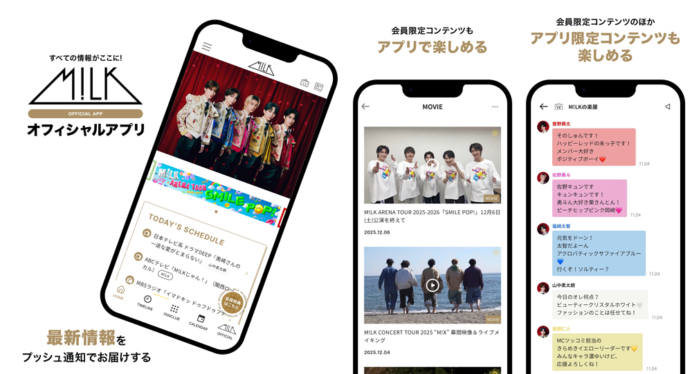 Selain itu, Anda dapat dengan mudah menikmati konten anggota dari klub penggemar resmi "PREMIUM MILK" di dalam aplikasi, dan konten eksklusif aplikasi baru "Ruang Ganti M!LK" juga telah dirilis, yang memungkinkan Anda untuk mengintip percakapan para anggota!