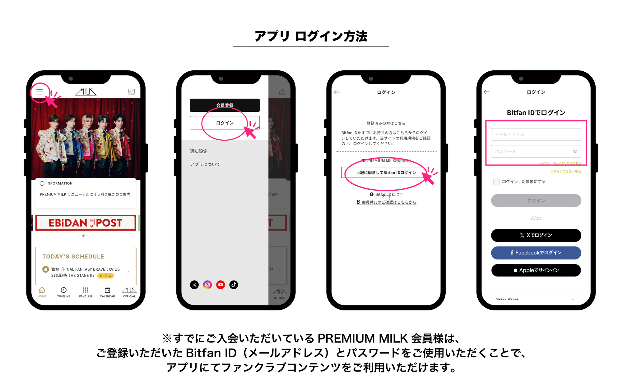 -Jika Anda adalah anggota "PREMIUM MILK", Anda dapat masuk menggunakan ID Bitfan Anda dari menu yang terbuka saat Anda mengetuk ikon di pojok kiri atas aplikasi.
