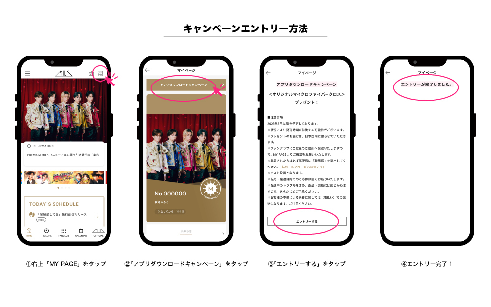 Anggota fan club yang mengunduh "Aplikasi Resmi M!LK" selama periode kampanye akan menerima kain mikrofiber original sebagai hadiah♪