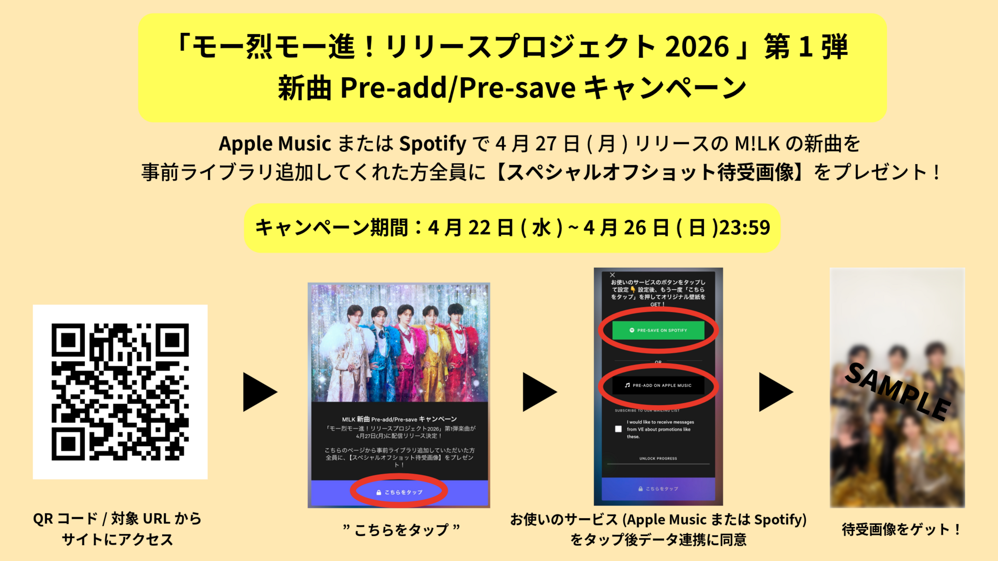 キャンペーン期間中にApple MusicまたはSpotifyで4月27日(月)リリースのM!LKの新曲を事前ライブラリ追加してくれた方全員に【スペシャルオフショット待受画像】をプレゼント!